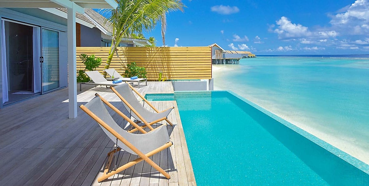 Sus espacios están construidos mezclando de diseño contemporáneo con el entorno en el que se levantan y se disponen a lo largo de la playa, en los jardines o encima del agua. Desde el aeropuerto se puede llegar en unos 20 minutos de vuelo en hidroavión.
